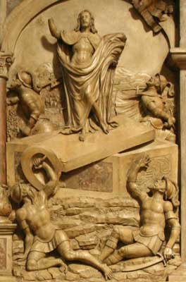 An der Wand des Willibaldschores (Westchor) befindet sich ein Renaissance-Denkmal für den Eichstätter Fürstbischof Eberhard II von Hirnheim (reg. 1552-1560). Es ist zweiteilig angelegt, zur Linken eine Kreuzigungsszene, rechts die Auferstehung (vgl. Detailausschnitt). Oben im Giebelfeld Gottvater. Der Sockel zeigt das Wappen des Bischofs zwischen zwei Inschriftentafeln mit Rollwerk an den Rändern.