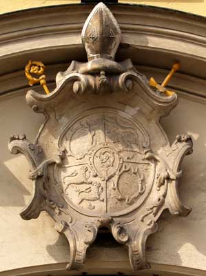 Das Wappen des Bauherrn, des Eichstätter Fürstbischofs Franz Ludwig Freiherr Schenk von Castell (1725-1736), an der Fassade ist geviert mit Herzschild: