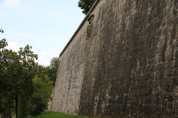 Das Kriegsglück der Schweden wendete sich 1634, denn sie erlitten in der Schlacht bei Nördlingen eine vernichtende Niederlage. Am 14.10.1634 konnte die Stadt Würzburg von der kaiserlich-katholischen Seite zurückerobert werden, erst einmal nur die Stadt. Franz von Hatzfeld betrat am 23.12.1634 wieder die Stadt, der Marienberg war aber noch in schwedisch-sächsischer Hand. Albert IV. von Törring, der dort gefangengehaltene Regensburger Bischof, vermittelte am 15.1.1635 einen Akkord zur gewaltlosen Übergabe des Marienberges an die katholisch-kaiserliche Seite und zum Abzug der Garnison. Zurück blieb ein verwüstetes Schloß, so daß der Fürstbischof und sein Hof in der Stadt residieren mußten. Es ist nicht klar, wo genau sich der Hof befand, eventuell im Juliusspital oder in einem der Domherrenhöfe. Diese traumatische Erfahrung für das geistliche Fürstentum, die Eroberung Würzburgs und die kurzfristige Umwandlung in ein weltliches Herzogtum, brachte die Wende im Denken, einen Richtungswechsel im Bewußtsein und in den Staatszielen: Definierte sich bisher die Herrschaft über das Hochstift vorrangig konfessionalistisch, traten nun das Kriegswesen und das militärstaatliche Element an oberster Stelle hinzu. Der Staat widmete sich fortan mit aller Kraft dem Ausbau der Landesfestungen Königshofen im Grabfeld und Marienberg und der Würzburger Stadtbefestigung, wobei erbeutete schwedische Pläne eine hilfreiche Grundlage waren, um die aktuellen Prinzipien der Festungsarchitektur der Zeit auf sich selbst anzuwenden. Der Marienberg wurde nun mit einem barocken Bastionssystem versehen, mit fünfeckigen, spitz zulaufenden Bastionen und Kurtinen dazwischen. Geschickt wurde die Böschung des Geländes in die neue Architektur einbezogen. Aber nicht nur die Festungsarchitektur wurde damit auf eine ganz neue Grundlage gestellt, sondern auch die Organisation des Heeres bis hin zur dauerhaften Armierung wurde auf eine ganz neue Grundlage gestellt. Der erste Fürstbischof, der sich mit Eifer in die Verwirklichung dieses neuen Staatsziels stürzte, war Johann Philipp I. von Schönborn (reg. 1642-1673), und deshalb ist sein Wappen an den barocken Befestigungsanlagen omnipräsent. In den nachfolgenden Abschnitten begleiten wir ihn bei seinem Festungsausbau.