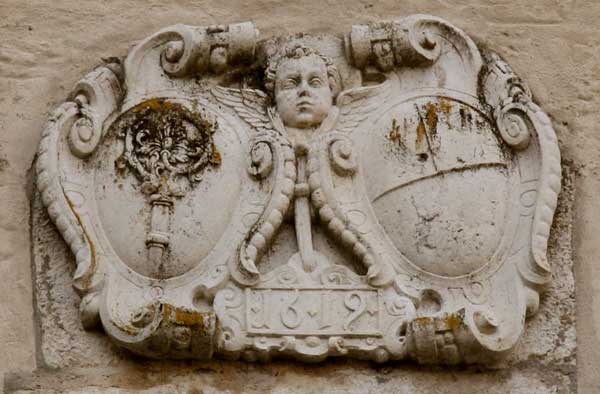 Das Wappen von Bauherr Johann Christoph von Westerstetten (reg. als Eichstätter Fürstbischof 1612-1636) befindet sich weiter oben an der Fassade über einem vergitterten Fenster und ist hier als Allianzwappen zwischen Bistumswappen und Familienwappen dargestellt: