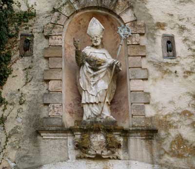 Ober Abb.: Blick auf die Willibald-Statue in ihrer mit Rustika-Steinen gerahmten Nische, per Inschrift datiert auf 1713. Die Figur im barocken Stil wird dem Eichstätter Bildhauer Christian Handschuher zugeschrieben. Man achte nicht nur auf den bemoosten Knebel-Wappenstein unter seinen Füßen, sondern auch auf die in die Mauer eingelassenen Rollen, über die einst die Ketten für die Zugbrücke liefen. Von dieser ist heute nichts mehr übrig, der Besucher kann mit dem Wagen sogar bis in den Burghof hochfahren. Dabei wird eine größe Höhendifferenz überwunden, stadtseitig haben wir 5 Geschosse, hofseitig nur zwei. Man kann sich vorstellen, welche Mühe es früher Tiere und Kutscher kostete, Lasten in diese Burg hineinzuschaffen. Der 63 m lange Tunnel konnte früher innen nocheinmal durch Fallgatter gesperrt werden, die Ausnischungen sind noch zu sehen.