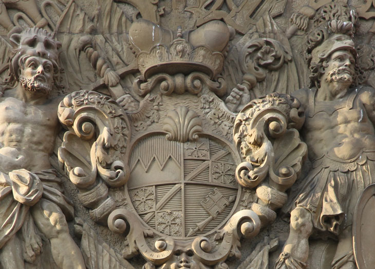 An der Nordface des Reichsravelins ist das Wappen des Fürstbischofs Peter Philipp von Dernbach (reg. 1675-1683) angebracht (Wappenfundstelle Nr. 79). Sein Wappen hat die ab 1675 gebräuchliche Form mit beiden Fürstbistümern und ist geviert mit Herzschild, Feld 1 und 4: in Gold ein rotbewehrter und rotgezungter, schwarzer Löwe, überdeckt von einer silbernen Schrägleiste, Hochstift Bamberg, Feld 2: "Fränkischer Rechen" = von Rot und Silber mit drei aufsteigenden Spitzen geteilt, Herzogtum zu Franken, Feld 3: "Rennfähnlein" = in Blau eine rot-silbern gevierte und an den beiden senkrechten Seiten je zweimal eingekerbte, schräggestellte Standarte mit goldenem Schaft, Hochstift Würzburg, Herzschild: in Blau drei deichselförmig zusammengestellte goldene Seeblätter, begleitet von goldenen Schindeln, Stammwappen der Grafen von Dernbach. Drei Jahre bevor er den Würzburger Bischofsstuhl bestieg, war er bereits Fürstbischof von Bamberg geworden.