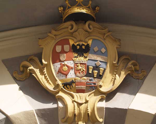Über diesem Tor zur Luitpoldstraße in dem nach außen fensterlosen Seitenflügel ein zweites Schönbornwappen unter dem markanten Segmentgiebel, in Rocaille-Werk eingepaßt, inhaltsgleich mit dem oben beschriebenen Schönborn-Wappen: