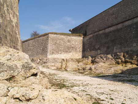 Blick aus dem Bastionsgraben auf die Nordbastion, rechts im Bild die Kurtine unterhalb des Hochschlosses, links die Rückseite der vorgeschobenen Lünette. Der Schatten rechts im Bild wird schon von der Westbastion (Hofmühlbastei) geworfen.