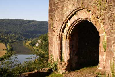 Abb.: Hinterburg, Blick auf den Eingang zur Kernburg, links der Neckar. Durch dieses Tor mit Birnstabprofil betreten wir den eigentlichen Kern der Anlage von unregelmäßig fünfeckigem Grundriß, den Bereich, der Bergfried, Brunnen und Palas enthält. Der vollständig ausgemauerte Brunnen von mindestens 23 m Tiefe hat übrigens ein interessantes Detail: In ihm zweigt in 18 m Tiefe ein begehbarer Gang in Richtung Mittelburg ab.