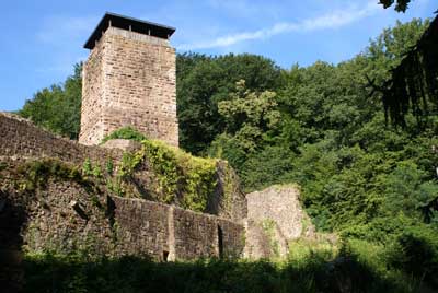 Abb.: Hinterburg, Blick auf den übereck gestellten Bergfried aus Nordosten. Der aus Buckelquadern aufwendig gemauerte Bergfried hat 9 m Seitenlänge und 2.5 m Mauerstärke sowie einen Schrägsockel. Er ist vom Innenhof aus über 25 m hoch; sein rundbogiger Eingang liegt in 12 m Höhe über verzierten Konsolsteinen. Eine angebaute Treppe gibt heute Zugang zu dem Turm, von dem man eine vorzügliche Aussicht über das Neckartal hat. Hinter dem Bergfried der Halsgraben. Unterhalb des Bergfriedes die 1.2-1.8 m dicke Ringmauer, darunter die Mauer des inneren Zwingers (nach der Zerstörung 1344 angelegt). Der äußere Zwinger (nach 1426 errichtet) liegt bereits darunter im Schatten.