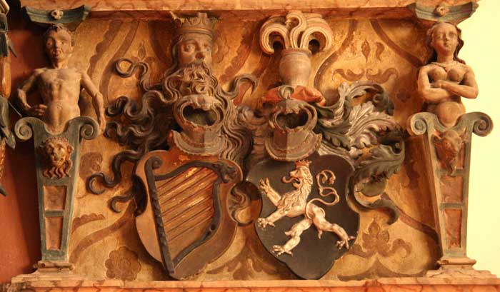 rechten Seite die acht Wappenschilde der Ehefrau (Ahnenprobe):