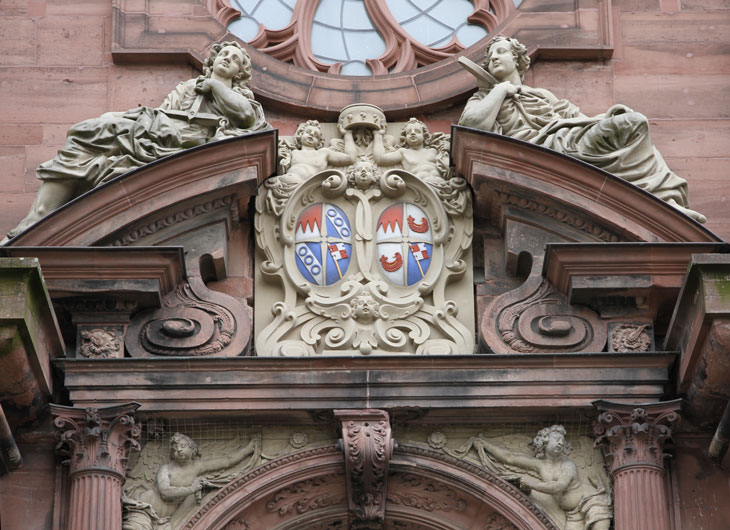 Das Wappen des Würzburger Fürstbischofs Julius Echter von Mespelbrunn befindet sich heraldisch rechts: Es ist geviert, Feld 1: "Fränkischer Rechen" = von Rot und Silber mit drei aufsteigenden Spitzen geteilt, Herzogtum zu Franken, Feld 2 und 3: Echter von Mespelbrunn, in Blau ein silberner Schrägbalken, belegt mit drei blauen Ringen, Feld 4: "Rennfähnlein" = in Blau eine rot-silbern gevierte, an den beiden senkrechten Seiten je zweimal eingekerbte, schräggestellte Standarte mit goldenem Schaft, Hochstift Würzburg. Das Wappen steht hier für den Gründer von Universität und Kirche und damit für den initialen Bauherrn, also Bauphase 1.