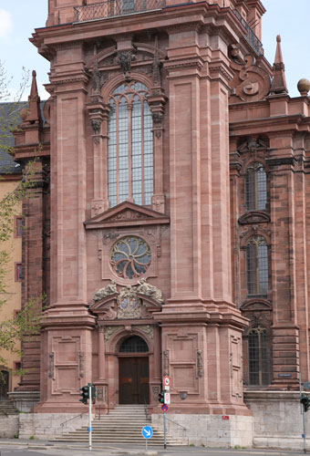 Der Dreißigjährige Krieg war 1648 vorbei, aber es dauerte noch geraume Zeit, bis man sich von den Nachwirkungen personell, finanziell etc. erholt hatte und man wieder an repräsentatives Bauen denken konnte. 70 Jahre lang stand die Kirche allem Wind, Wetter, Regen und Schnee offen. Erst Fürstbischof Johann Gottfried von Guttenberg vergab 1696 den Auftrag an Antonio Petrini, die Kirche zu retten und zu vollenden (Bauphase 3). Und wenn man schon gerade dabei ist, auch dem neuen, barocken Zeitgeschmack anzupassen. Das Kirchenschiff bekam ein neues Gewölbe und ein neues Dach. Im Hauptschiff wird das Gewölbe aus durch Quergurte getrennten Kreuzgewölben gebildet, in den Seitenschiffen analog aus Kreuzrippengewölben mit rippenartig betonten Graten. Damit der Neubau hielt, vermehrte man die Anzahl der Strebepfeiler außen von 6 auf 9 an der Südseite. Es entstanden also 3 zusätzliche, und die älteren 6 mußten nach 70 Jahren Untätigkeit erst einmal restauriert werden. Der Turm aus rotem Mainsandstein wurde mit einem zweiten Obergeschoß und einem Oktogon versehen; die Westfassade wurde barock überarbeitet. Echters Grabmal wurde abgebrochen.