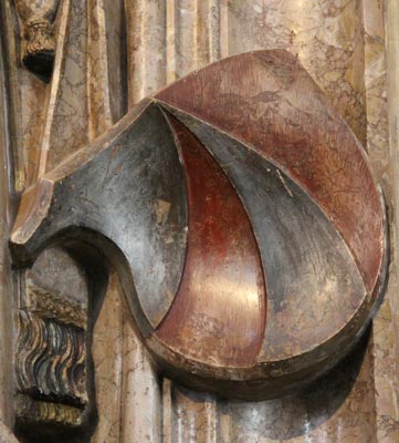 Bei dem oben vorgestellten Epitaph tauchen zwar die einzelnen Komponenten des Bischofswappens auf, nicht aber das zusammengesetzte fürstbischöfliche Amtswappen für Rudolf von Scherenberg (1466-1495). Ein solches finden wir an anderer Stelle im Würzburger Kiliansdom, nämlich in die südliche Wand des südlichen Seitenschiffs eingemauert, ohne weiteren Kontext.
