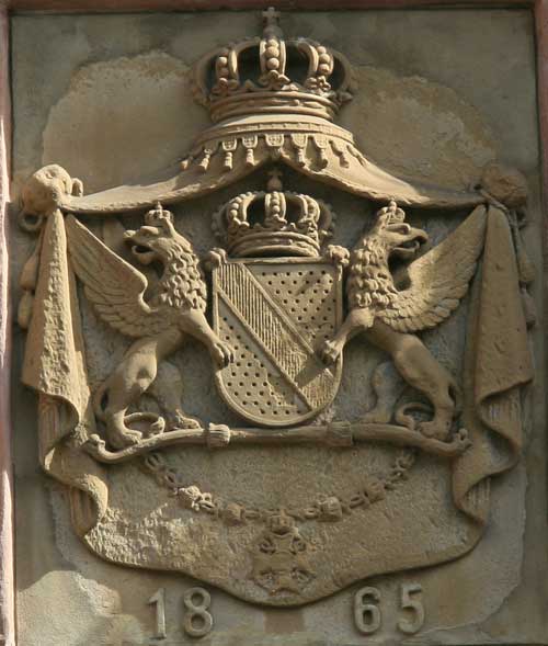 Das auf 1865 datierte badische Wappen über dem Torbogen ist hier im Schild auf das Stammwappen reduziert, in Gold ein roter Schrägbalken. Es handelt sich insgesamt um das Wappen des Erbgroßherzoges von Baden. Der Schild ist von einer Königskrone gekrönt. Als Schildhalter finden wir zwei widersehende, königlich gekrönte, golden bewehrte, silberne Greifen, die auf einer Art Joch stehen, von dem eine Ordenskette herabhängt.