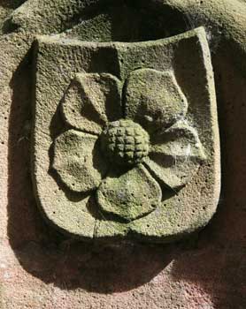 In der linken Abb. sehen wir den Wappenschild der Grafen von Eberstein, in Silber eine rote, blau besamte Rose. In der rechten Abb. haben wir den Wappenschild der Markgrafen von Baden-Sponheim, geviert von Baden (in Gold ein roter Schrägrechtsbalken) und Sponheim (von Rot und Silber geschacht).