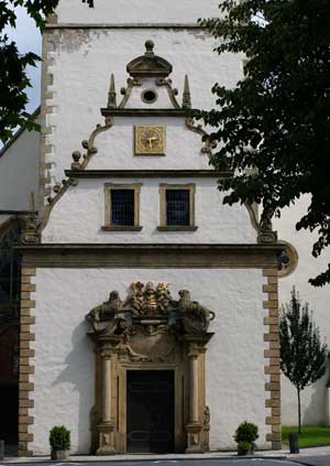 Man mag gar nicht glauben, wie alt diese Kirche ist, welche Baugeschichte sich hinter der heute prägenden Fassade des 17. Jh. ist. Selbige wurde als neue Westvorhalle im Jahre 1667 von Bischof Ferdinand von Fürstenberg gestiftet.