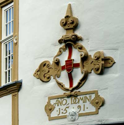 Das Interessanteste an diesem Wappen ist der Umgang mit den Helmen: Bei drei Helmen auf einem Schild wird der Platz schnell begrenzt, und die Helme müssen proportional kleiner werden. Sie stehen eng nebeneinander, und die Helmdecken knüllen zwischen ihnen und kommen nicht zur Geltung. Meist schiebt man die äußeren Helme sogar ein bißchen über die Schildecke hinaus, um die Helme nicht unnatürlich klein werden zu lassen und darstellerische Probleme zu bekommen. Hier ist eine kreative Möglichkeit gefunden worden, die Helme gut nebeneinander zu positionieren: Die beiden äußeren Helme ruhen auf goldenen, rot verzierten Säulen, die neben den Schild gestellt sind, heraldische Hutständer sozusagen. Das hat hier den Vorteil, daß man das in großer Höhe befindliche Wappen noch in allen Details befriedigend erkennen kann.