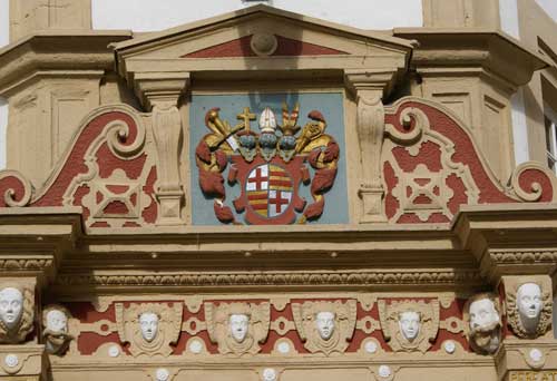 Das reichgeschmückte Portal enthält in seiner Dekoration drei Wappen, oben im volutengeschmückten Giebel das fürstbischöfliche Wappen und im Portalbogen die Wappen seiner Eltern, Fürstenberg und Westphalen.