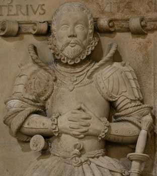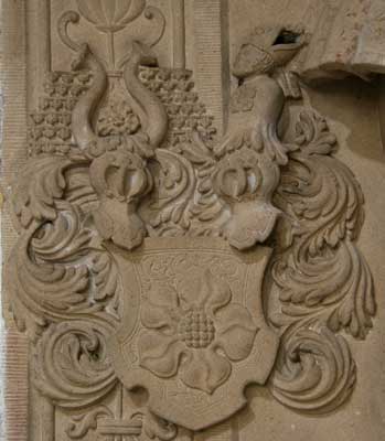 Heraldisch links finden wir das Wappen seiner Frau Margarethe von Dietz (14.10.1544-1608) mit den beiden Löwen übereinander, nicht die seiner Eltern (Johann Jakob I. Graf von Neu-Eberstein (20.1.1517-8.3.1574) und Barbara Rhein- und Wildgräfin von Dhaun-Oberstein (-14.2.1546) - vgl. die Abhandlung über die Wappen der Rhein- und Wildgrafen von Dhaun. Margarethe von Dietz war eine Tochter von Landgraf Philipp dem Großmütigen von Hessen aus dessen zweiter Ehe, die nicht ganz standesgemäß war. So trug sie nicht Titel und Wappen der Landgrafen, sondern einer Gräfin von Dietz. Dafür wurde das Schildmotiv der Grafen von Dietz, das längst Eingang in das landgräfliche Wappen gefunden hatte, für sich alleine zu neuem Leben erweckt.