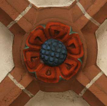 freigestellte Ebersteiner Rose und Schild mit dem Wappen Baden-Sponheim auf Schlußsteinen des Gewölbes
