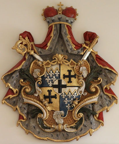 Eine weitere Gruppe von Wappen in den historischen Schauräumen des Stadtschlosses ist dem Fürstabt Adolf von Dalberg (1726-1737) zuzuordnen. Die obige Abb. zeigt ein solches als Stuck-Version. Das Wappen des Fürstabtes ist wie folgt aufgebaut: Hauptschild geviert, Feld 1 und 4: unter einem goldenen Schildhaupt, in das drei blaue Spitzen aufwärtssteigen, in Blau 6 (3:2:1) silberne Lilien (Stammwappen der Kämmerer von Worms), Feld 2 und 3: in Gold ein schwarzes Ankerkreuz (Stammwappen der von Dalberg), Herzschild: In Silber ein schwarzes durchgehendes Kreuz (Fürstabtei Fulda). Hinter der üppig gestalteten Kartusche das gestürzte Schwert und der Krummstab, in der Mitte auf dem Wappenschild ein Fürstenhut.