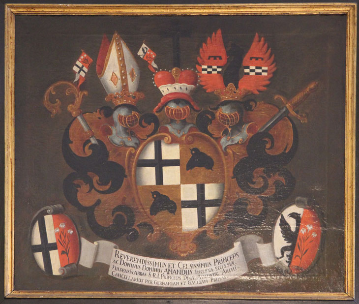 Ein Gemälde stellt das Wappen des Amand von Buseck (1737-1756) dar, hier noch als Fürstabt. Die Inschrift lautet: "REVERENDISSIMUS ET CELSISSIMUS PRINCEPS / AC DOMINUS DOMINUS AMANDUS INCLYTAE ECCLESIAE / FULDENSIS ABBAS S(ACRI) R(OMANI) I(MPERII) PRINCEPS DIVAE AUGUSTAE ARCHI/CANCELLARIUS PER GERMANIAM ET GALLIAM PRIMAS". Er war Fürstabt 1737-1752, Fürstbischof ab 1752, denn am 5.10.1752 wurde die Fürstabtei durch Papst Benedikt XIV. in den Rang eines Bistums erhoben. Das Wappen ist geviert, Feld 1 und 4: in Silber ein schwarzes durchgehendes Kreuz, Hochstift Fulda, Feld 2 und 3: in Gold ein rot gezungter, nach innen gewendeter schwarzer Widderkopf. Über dem Wappen stehen drei Helme:
