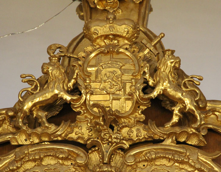 Detailvergrößerung der zentralen, ovalen Wappenkartusche mit den zwei widersehenden, gekrönten Löwen als Schildhaltern