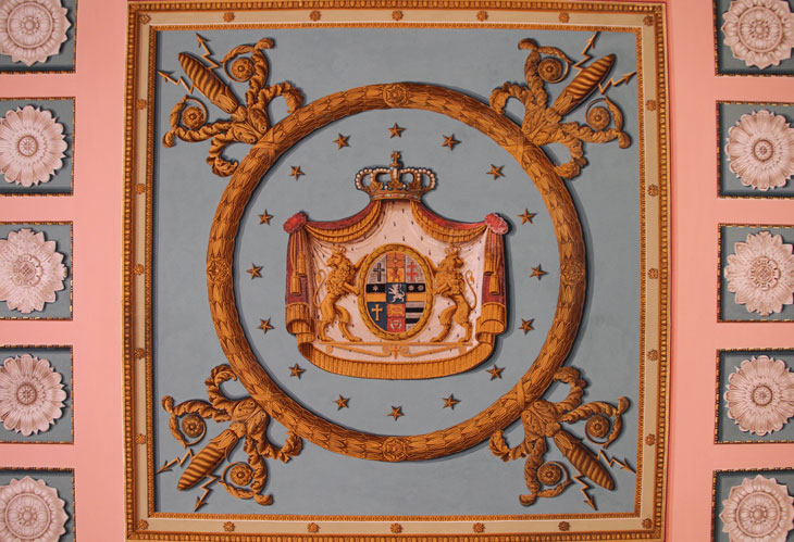 Sein Wappen begegnet dem Besucher ein weiteres Mal an einem Konsoltisch, aber nur mit dem Schildmotiv, mit Fürstenhut, Krummstab und Schwert. Oben: Totale, unten: Ausschnittsvergrößerung.