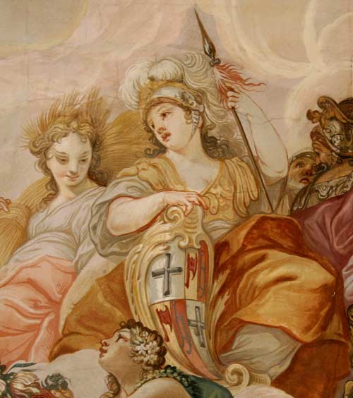 Abb.: Ceres (links) und Minerva (Mitte), letztere mit dem Wappen des Fürstabtes