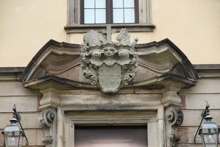 Im verkröpften Segmentbogengiebel befindet sich ein weiteres Wappen des Adalbert von Schleifras.