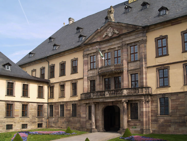 Zentralbau des Schlosses, auf den die beiden Seitentrakte hinlaufen, ist der dreistöckige Querbau, der im zweiten Obergeschoß den Fürstensaal enthält. Nach hinten setzt sich dieser Kernbau in zwei ebenfalls dreistöckigen Seitenflügeln fort. Der Ehrenhof ist relativ schmal und lang. Wäre der Mittelbau ebenfalls zweistöckig, würde er sich klein ausnehmen und sich optisch in der Ferne verlieren. So aber wird mit einmal der Eindruck wieder auf die vorne wahrnehmbare Höhe zurückgesetzt, der Mittelbau ist nah und fern zugleich. Und in dem Maße, in dem man auf ihn zugeht, wächst er über die Dachlandschaft der Seitenflügel empor und erscheint immer wuchtiger - ein durchaus kalkulierter Effekt. Durch die Durchfahrt gelangt man in den zentralen, auf allen Seiten bebauten Hof.