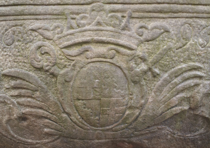 Das zweite Wappen ist dagegen etwas versteckter und zwischen den Ornamenten der Brunnenschale verborgen. in der Gesamtansicht erkennt man es an der rechten Seite der Schale am Übergang zum Halbschatten. Es ist auf 1696 datiert. Die Konturen sind im Detail etwas verwittert und schwer zu erkennen. Diese Brunnenschale war Teil der ersten Gartengestaltung unter Placidus von Droste, ehe ünter den späteren Fürstäbten und Fürstbischöfen das Konzept geändert wurde..