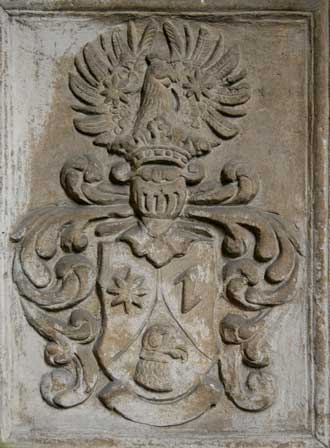 Das Wappen Kopf zeigt eine eingebogene Spitze, auf Platz 1 einen achtstrahliger Stern, auf Platz 2 einen Doppelhaken (Wolfsangel), in der eingebogenen Spitze (Platz 3) ein Brackenkopf mit Halsband. Auf gekröntem Helm Kopf und Hals eines Hahnes zwischen einem Flug, der beiderseits mit einem achtstrahligen Stern belegt ist.
