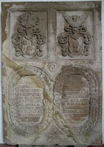 Neben der herausragenden spätgotischen Tumba befinden sich im Chor der Klosterkirche Blomberg weitere Grabplatten. Die hier abgebildete erinnert an den Anthon Günther Kopf (geb. 1647, gest. 1707), schaumburg-lippischer Amtmann, Rat und Präfekt von Blomberg, und seine Ehefrau Elisabeth Kopf (geb. 18.6.1660, gest. 23.8.1712), geb. Theopold, Enkelin des ersten reformierten Pastors der Gemeinde, Abraham Theopold (gest. 1657), dessen Grabplatte sich auf der anderen Seite des Chores befindet (ohne Abb., zusammen mit seiner Gemahlin Elisabeth Stapperfenne).