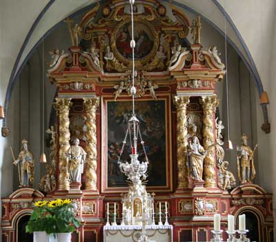 Abb.: Blick auf den Hochaltar der Klosterkirche Corvey. Das beschriebene Wappen befindet sich zwischen den beiden Engeln im Gebälk über dem Altarbild, teilweise verdeckt durch die Lampenkette.