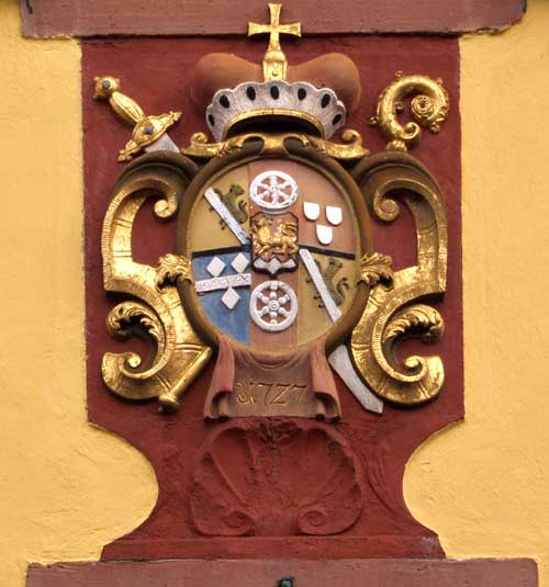 Am Renteigebäude befindet sich über dem Eingang das Prunkwappen des Mainzer Erzbischofs und Kurfürsten Lothar Franz von Schönborn. Lothar Franz von Schönborn, seit 1701 Reichsgraf, war in zwei Bistümern Bischof: Bamberg ab 1693 und Mainz ab 1695, jeweils bis 1729. Wir finden also aus seiner Mainzer Zeit nur kombinierte Wappen Bamberg und Mainz. Das Wappen ist wie folgt aufgebaut: