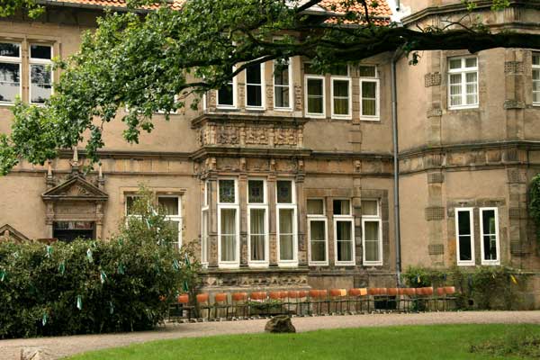 Eines der typischsten Elemente der Weserrenaissance, die Auslucht (Utlucht), finden wir ebenfalls auf der Südseite des im Schatten großer alter Bäume liegenden Schlosses Barntrup. Typisch für diese Ausluchten ist die leichte Konstruktion, die enge Reihung schmalrechteckiger Fenster, die von stark verzierten Säulchen oder - wie hier - Pilastern voneinander abgegenzt sind, die Durchfensterung auch der seitlichen schmalen Teile, und die überreiche Verzierung der wenigen notwendigen geschlossenen Mauerflächen, so daß vor dem Hintergrund des wuchtigen Baukörpers mit seinen kastellartigen Ecktürmen, die aber nie zur Verteidigung konzipiert waren, die Auslucht zu einer filigran und zerbrechlich wirkenden architektonischen Kostbarkeit wird.