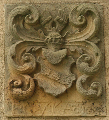 Das vierte Wappen von links auf der Vorderseite des Erkers ist das Wappen der von Canstein. Der Schild zeigt in Silber einen golden gekrönten Raben. Auf gekröntem Helm ein schwarzer, golden gekrönter Rabe vor einer silbernen, oben mit schwarzen Hahnenfedern besteckten Säule (auch als Köcher oder Schaft angesprochen). Helmdecken schwarz-silbern. Details zur Familie siehe Beschreibung des Portales.