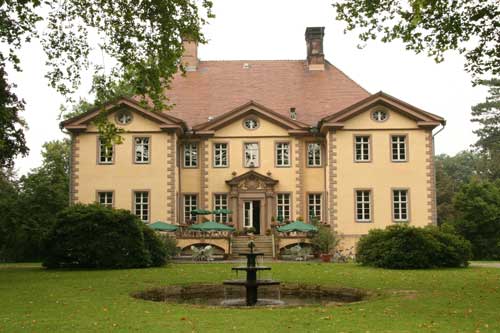 Schloß Schieder war die barocke Sommerresidenz der lippischen Fürsten. Es liegt in einem großen Park an einem Hang, dessen Gefälle für eine großartige Garten- und Parkgestaltung genutzt wurde. Eine lange zentrale Achse läuft vom Schloß herunter bis an den Fluß Emmer, von Alleebäumen und symmetrischen Bauten gesäumt.