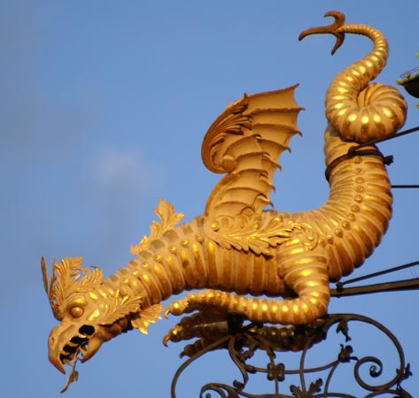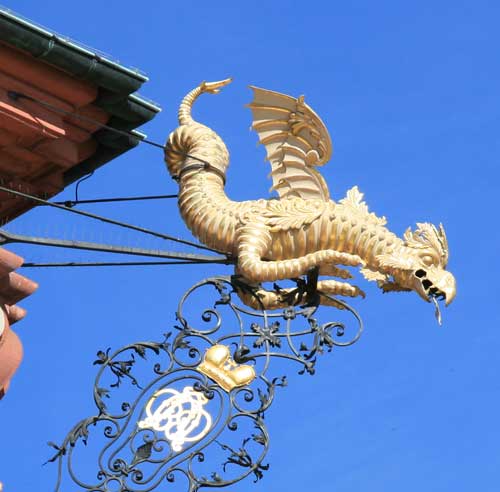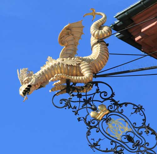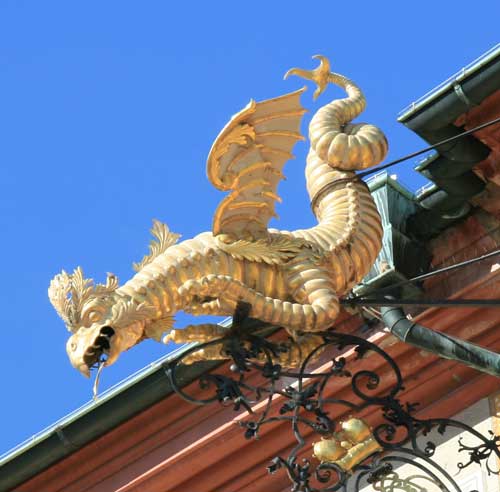 Abb.: Detail vom Corps de logis, zweibeiniger geflügelter Drache (Wyvern). Rechte Gebäudeecke.
