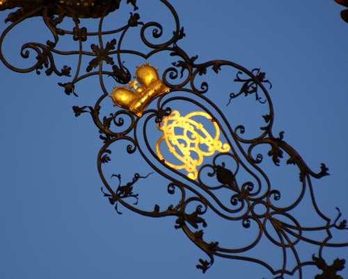 Filigrane Schmiedeeisenkonstruktion mit Monogramm und Krone.