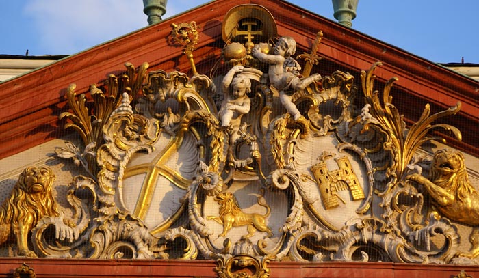 Die Ausschmückung des Giebelfeldes erfolgte jedoch nicht unter Damian Hugo von Schönborn, sondern erst später 1752 unter seinem Nachfolger Franz Christoph Freiherr von Hutten, vermutlich aus Achtung vor dem Werk seines Vorgängers. Die Ausführung erfolgte durch den Stukkateur Johann Michael Feichtmayr aus Augsburg.