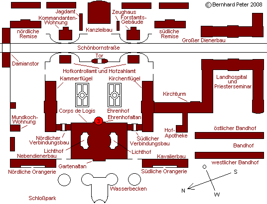 Bruchsal: Übersicht + Konzept - Kammerflügel (1) - Kammerflügel (2) - Corps de logis, Ehrenhof - Kirchenflügel (1) - Kirchenflügel (2) - Schloßkirchturm - Forstamtsgebäude - Kanzleibau - Kommandantenwohnung - Damianstor - Landhospital - Großer Dienerbau - Corps de logis, Gartenseite - Torpfosten - Hofapotheke