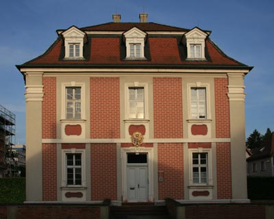 Abb.: Blick von Osten auf die Rückseite des Forstamtes. Das Wappen befindet sich über dem Eingang der repräsentativen Vorderseite der Schönbornstraße zugewandt.