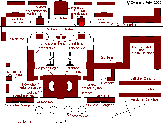 Bruchsal: Übersicht + Konzept - Kammerflügel (1) - Kammerflügel (2) - Corps de logis, Ehrenhof - Kirchenflügel (1) - Kirchenflügel (2) - Schloßkirchturm - Forstamtsgebäude - Kanzleibau - Kommandantenwohnung - Damianstor - Landhospital - Großer Dienerbau - Corps de logis, Gartenseite - Torpfosten - Hofapotheke