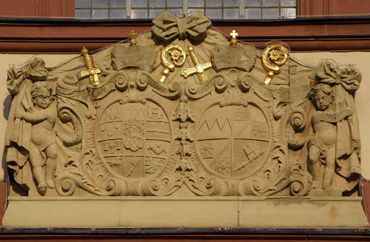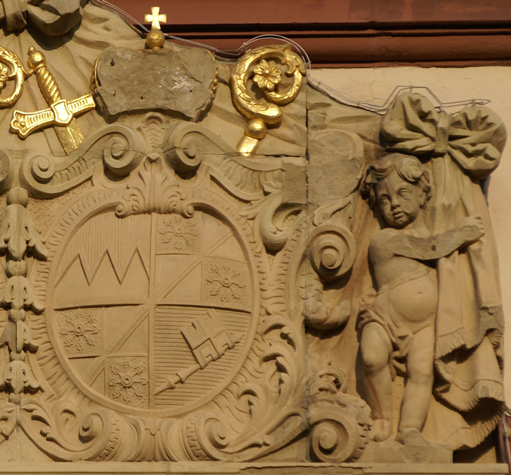 Über beiden Wappen sind jeweils Fürstenhut bzw. Herzogshut (bei beiden ist die vordere Partie abgeplatzt und renovierungsbedürftig), schrägrechts dahinter das gestürzte Schwert und schräglinks der Krummstab angebracht, jeweils als Symbole der Landesherrschaft, der weltlichen und der geistlichen Gerichtsbarkeit. Zwei Putten stehen seitlich außen und raffen den gemeinsam genutzten Wappenmantel zur Seite.