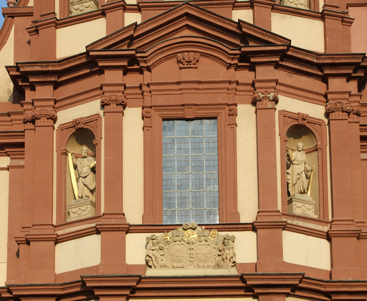 An anderer Stelle wurde die prinzipielle Gegensätzlichkeit der Fürstbischöfe Greiffenclau und Schönborn aus zwei rivalisierenden Familien behandelt. Jeder hatte seine "eigenen" Baumeister, und keiner hätte gerne mit einem Baumeister der anderen Seite zusammengearbeitet. Bei einigen Bauten führte diese Rivalität sogar zu Schikanen und Baustop angefangener Bauten nach dem Wechsel auf dem Würzburger Bischofsthron (siehe z. B. Rückermaingebäude). Hier liegt die Sache jedoch anders: Johann Philipp von Schönborn war selbst in dieser Kirche, also der Vorgängerkirche, getauft worden, und deshalb lag ihm dieser Neubau, obwohl von einem Greiffenclau-Bischof begonnen, sehr am Herzen. Er nahm auch selbst nach Fertigstellung am 26.1.1721 persönlich die Weihe der neuen Kirche vor. Und so kommt es, daß hier die beiden Bischöfe aus rivalisierenden Familien friedlich nebeneinander stehen.