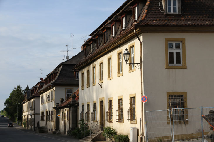 Die Bebauung der Ostseite von Schloßplatz und Kanzleistraße wurde schon 1704 in Angriff genommen, um die Residenz mit allen notwendigen Funktionsbauten zu versehen. Früher waren all diese Funktionen auf dem Schloßareal untergebracht, und durch dessen großzügigen Ausbau waren die entsprechenden Bau- und Räumlichkeiten nicht mehr vorhanden und mußten neu geschaffen werden. Den Anfang machte das Brauhaus in der Kanzleistraße. 1712 wurde das Pfarrhaus südlich der Kirche fertiggestellt, ein stattlicher Bau von Leonhard Dientzenhofer. Danach folgten 1723-1729 die Beamtenhäuser nach einheitlichem Schema: zweistöckig, Mansarddach, Portal in der Mittelachse mit Freitreppe davor, strenge Achsensymmetrie. Von der Pfarrkirche nach Norden kommt zuerst der Fasanenhof mit zwei großen Blöcken und einem einstöckigen Mittelbau dazwischen (Abb. unten) sowie zwei Hofportalen mit Vasenaufsätzen. Seinen Namen hat er entweder wegen der Nähe zum Fasanenbach, oder weil hier der Verwalter einer Fasanerie wohnte. Den nördlichen Abschluß bildet der Seehof. Der Baumeister dieses Ensembles war Johann Georg Seitz. Leider verschwanden seit den 1960er Jahren durch den Ausbau der nach Norden führenden Verkehrsader viele Details aus dem Vorbereich vor den Häusern.