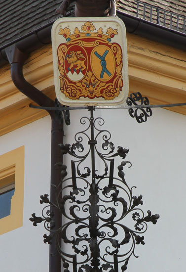 Über dem Rathauseingang sehen wir über dem Segmentbogengiebel zwischen den beiden mittleren Fenstern des Obergeschosses das Schönborn-Stammwappen, in Rot auf drei silbernen Spitzen ein schreitender goldener Löwe mit blauer Zunge und eigentlich blauer Krone, hier mitvergoldet.