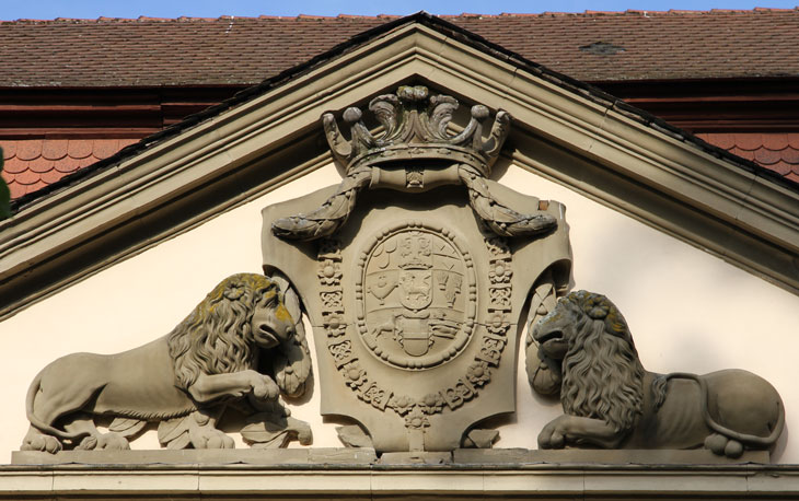 Abb.: Über der Tordurchfahrt des gegenüber dem Schloßpark liegenden Verwaltungsgebäudes (Seehof) prangt das Schönborn-Wappen alleine, von zwei mächtigen kauernden Löwen ungleicher Größe flankiert. Es verweist auf den Bauherrn, Rudolph Franz Erwein von Schönborn (23.10.1677-22.9.1754). Zustand 2014.