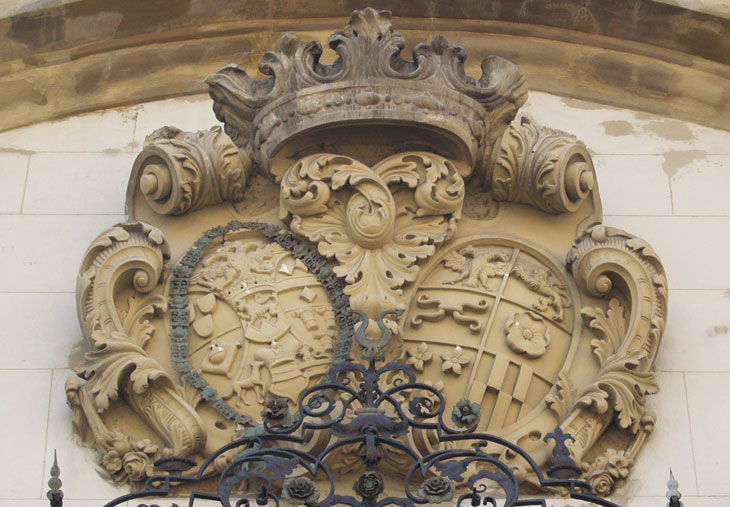 Abb.: Die heraldischen Inhalte sind die gleichen wie am Schloß und an der Kirche und entsprechen der oben gegebenen Beschreibung, die Anordnung und Aufteilung der Felder entspricht derjenigen an der Kirche. Man beachte ferner die Ordenskette mit Elementen aus Feuerstählen, den Orden vom Goldenen Vlies, dazu unten mehr. Zustand 2014.