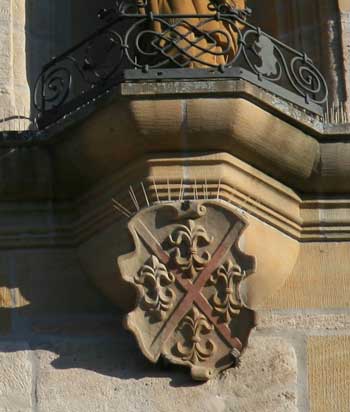 Die Konsolen der beiden Statuen der Klostergründer Hariolf und Erlolf tragen das ihnen angedichtete Wappen, das heutige Stadtwappen von Ellwangen.