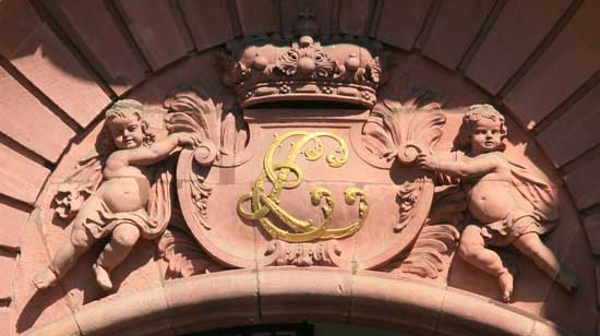 Abb.: Monogramm von Ernst Ludwig Landgraf v. Hessen-Darmstadt (15.12.1667 - 12.9.1739) über dem Eingang in den Westflügel, durch den man in den Parforcehof gelangt. Das gleiche Monogramm begleitet uns vielfach in den Zwischenräumen zwischen den Konsolsteinen des Hauptgesimes an der Front unter dem Dachansatz.
